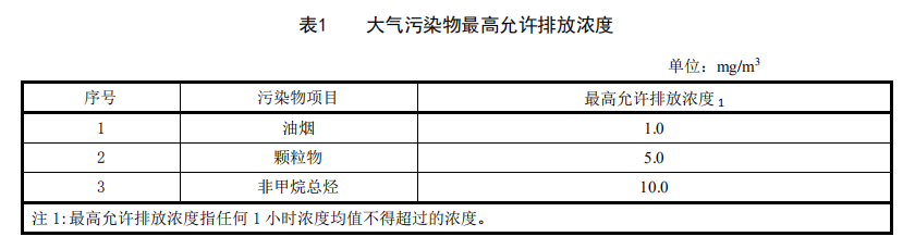 4.1.1 自本標(biāo)準(zhǔn)實施之日起,餐飲服務(wù)單位排放的油煙、顆粒物的最高允許排放濃度,應(yīng)符合表 1 的規(guī)