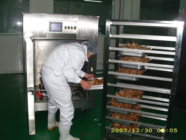 2、冷卻均勻,品質(zhì)高。真空冷卻的冷卻是表面和中心同時(shí)進(jìn)行,冷卻溫度均勻,不會(huì)外冷內(nèi)熱。而強(qiáng)風(fēng)和冷庫(kù)在冷卻的時(shí)候是外表先冷,這樣會(huì)導(dǎo)致食品外冷內(nèi)熱,影響口味并會(huì)引起細(xì)菌繁殖。